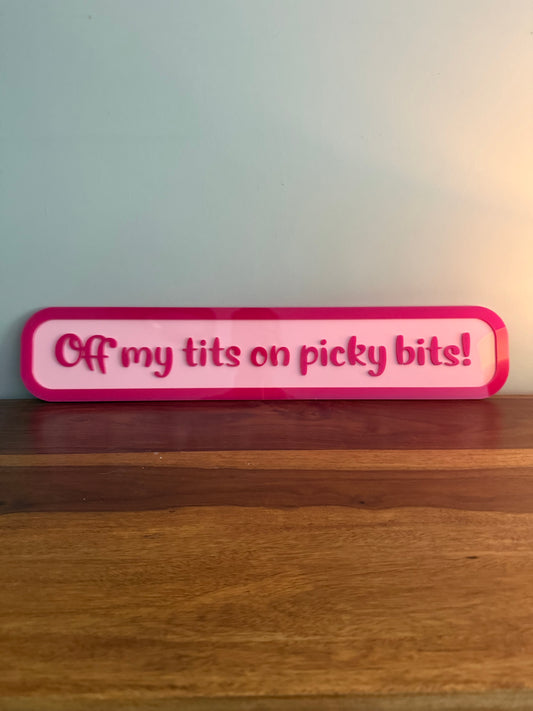'Off my tits on picky bits' - Street style sign, wall decor.