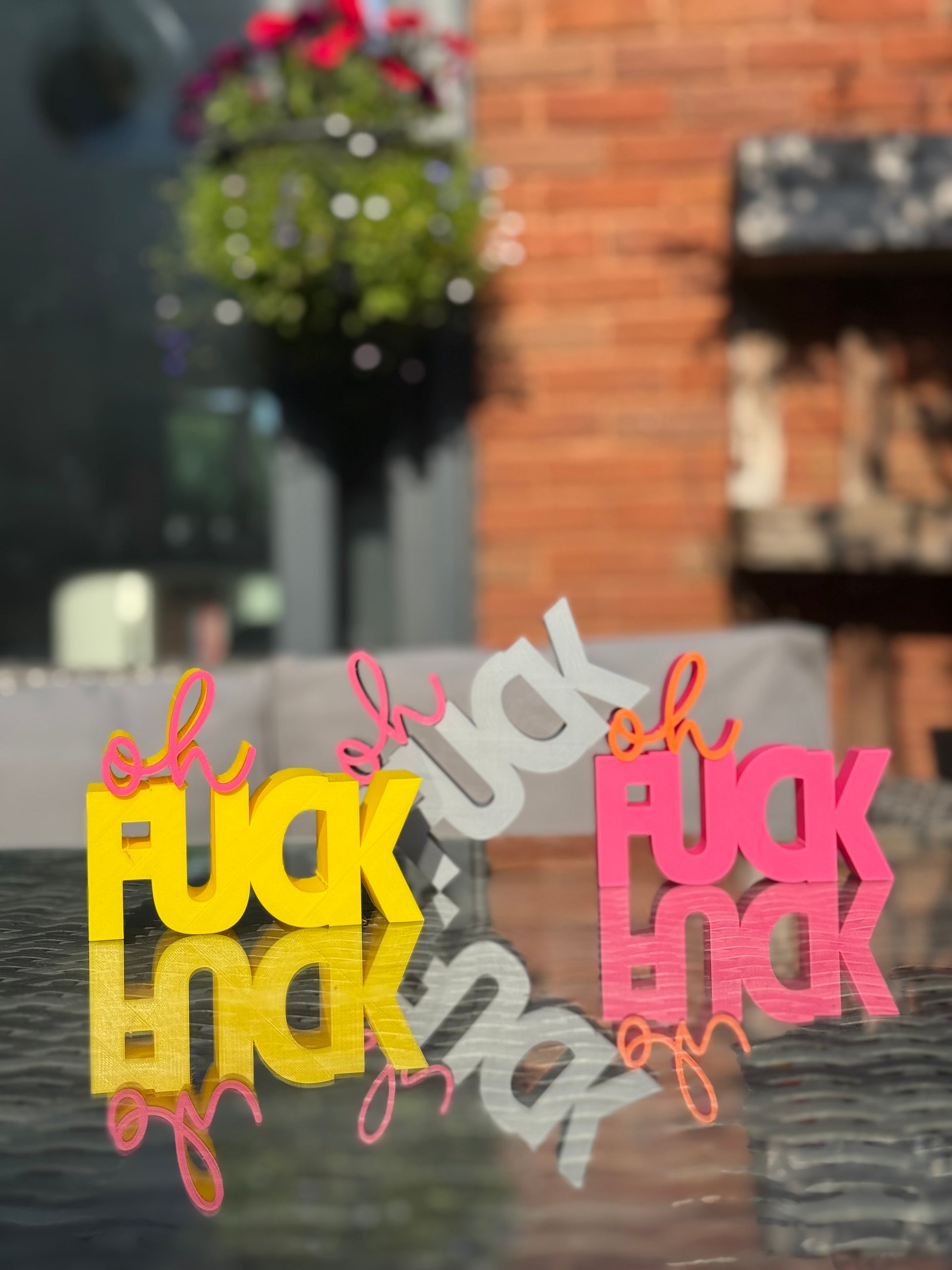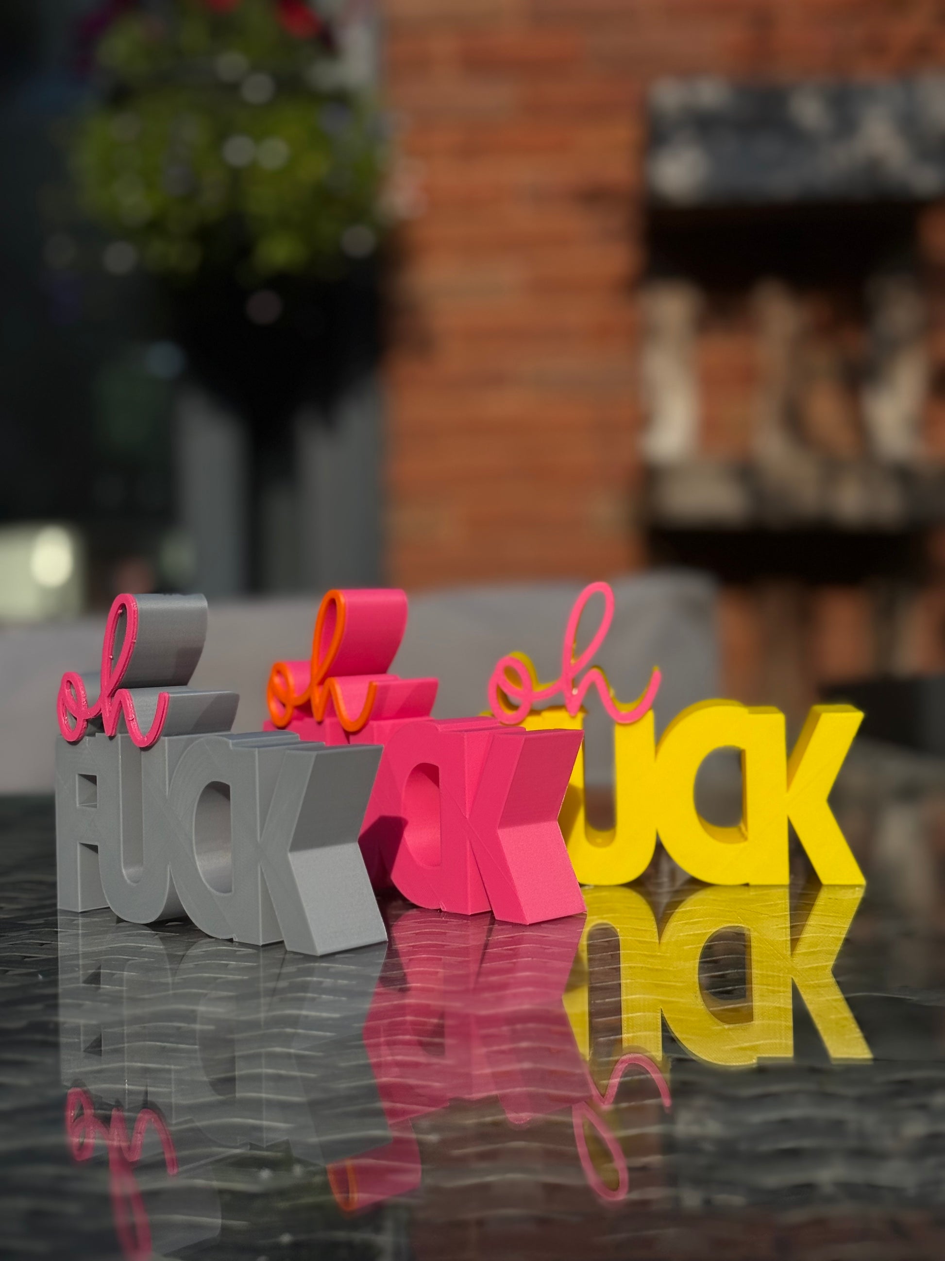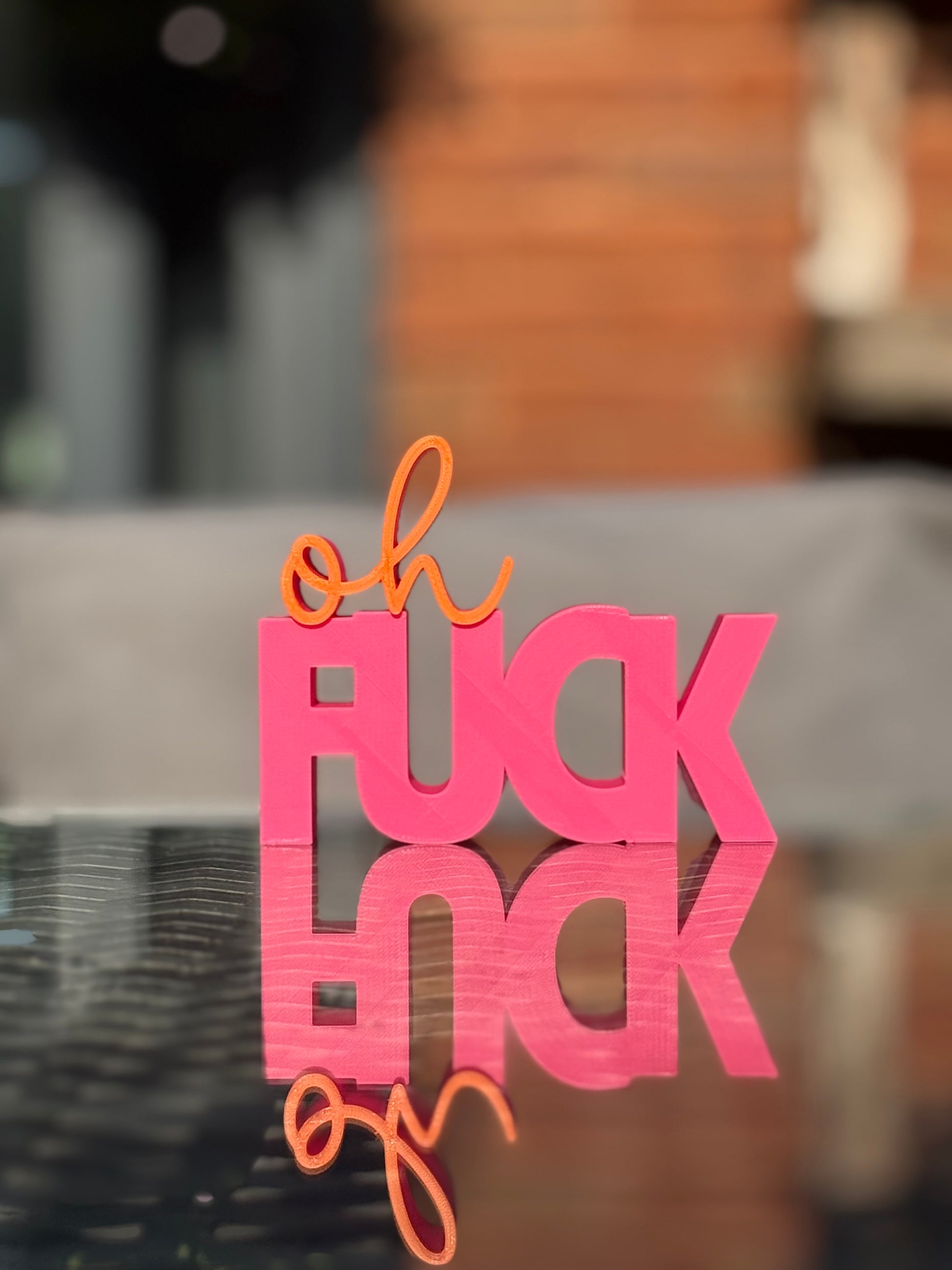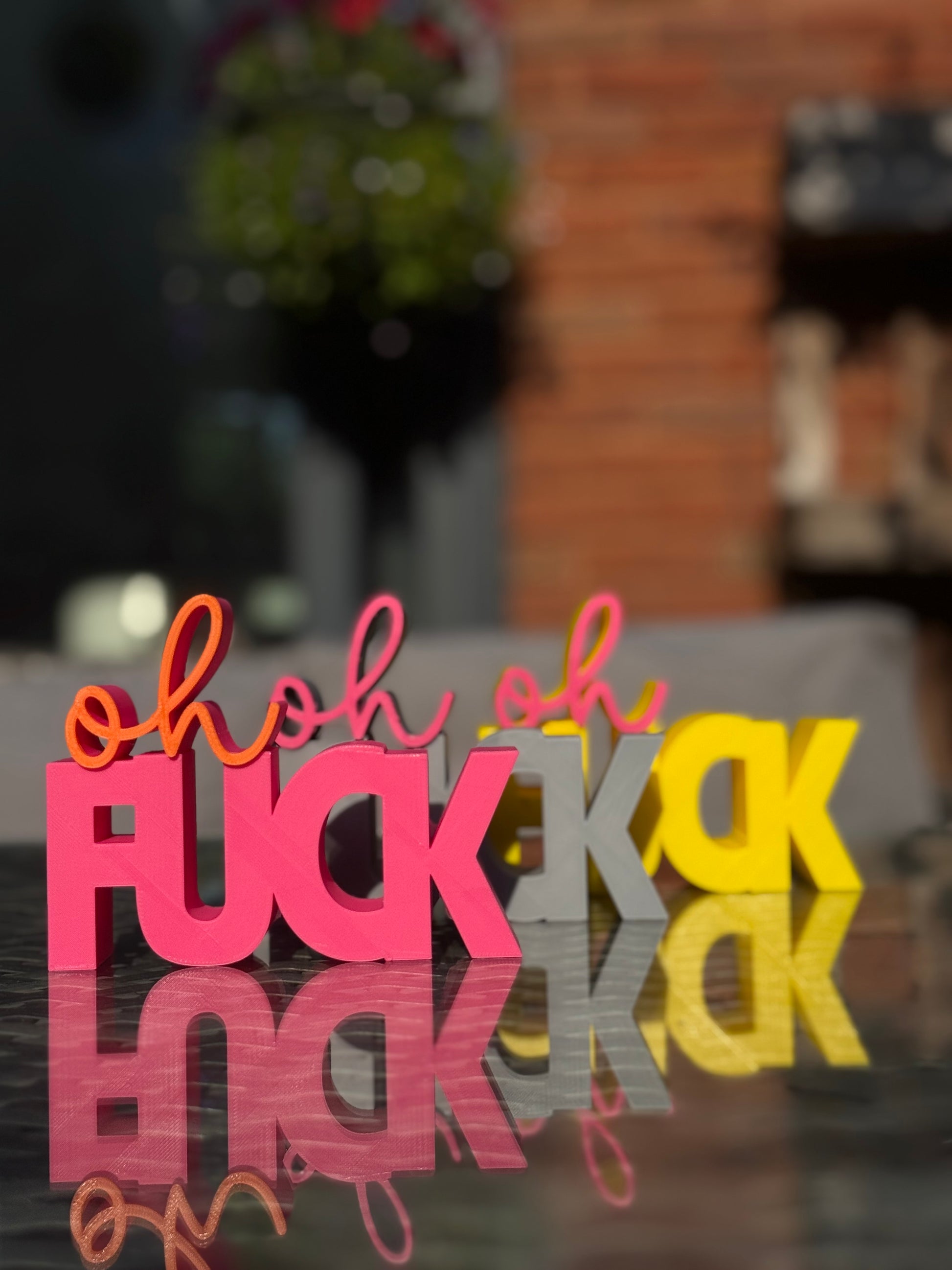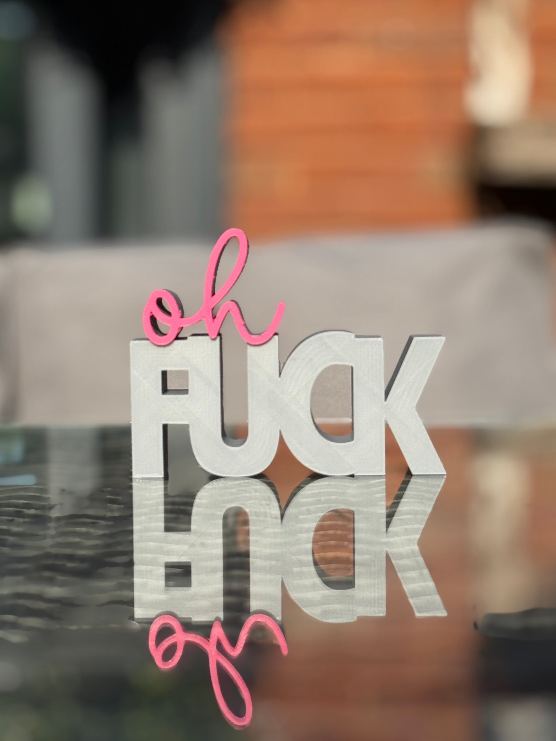 Add a pop of colour and personality to your space with this cheeky “Oh Fuck” sign! Featuring bold block letters and a playful script, this modern 3D printed decor piece is the perfect mix of sass and style. Whether you’re decorating your office, desk, shelf, or gifting to a friend who appreciates a little humour, this eye-catching piece is sure to be a conversation starter.