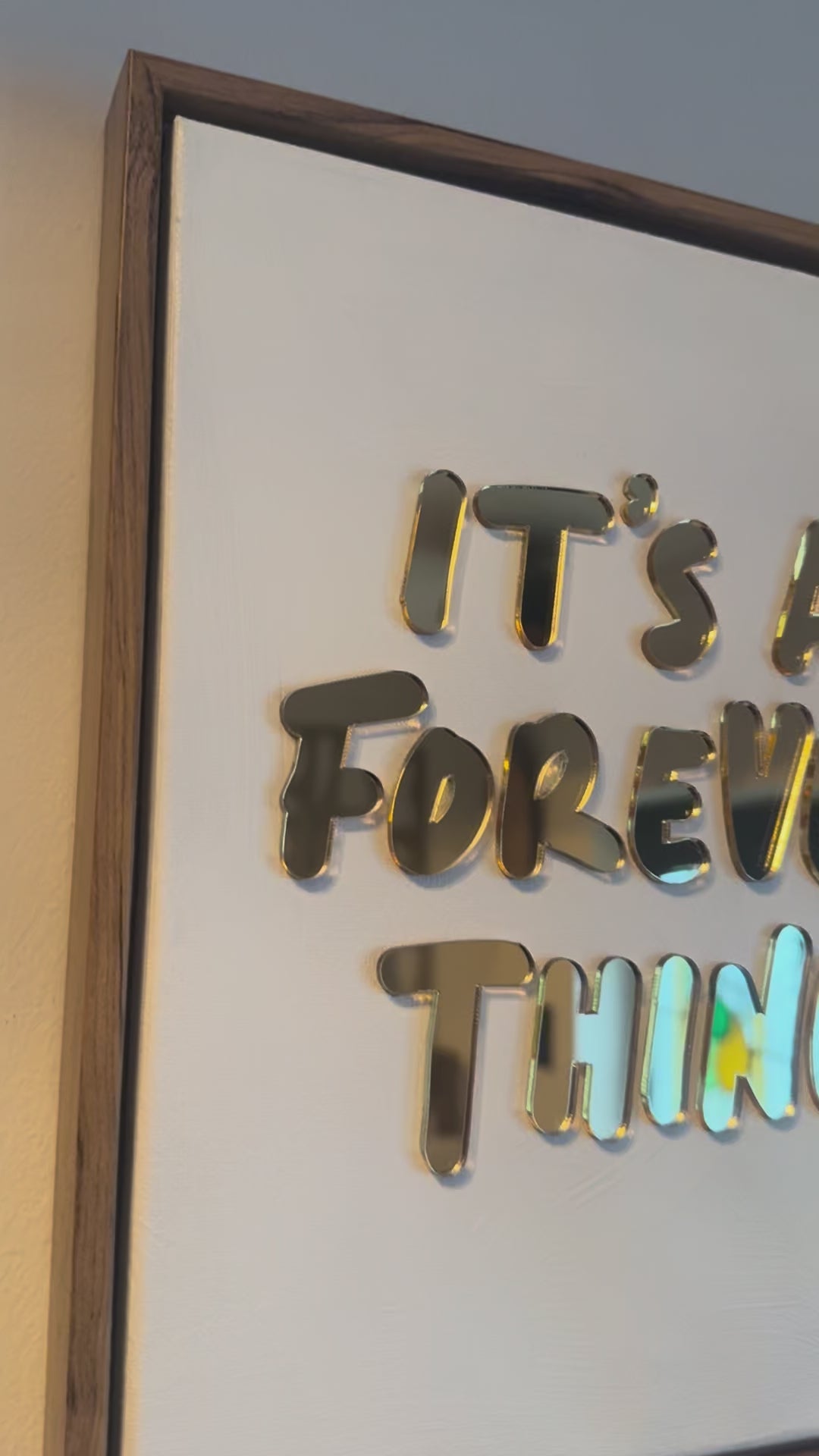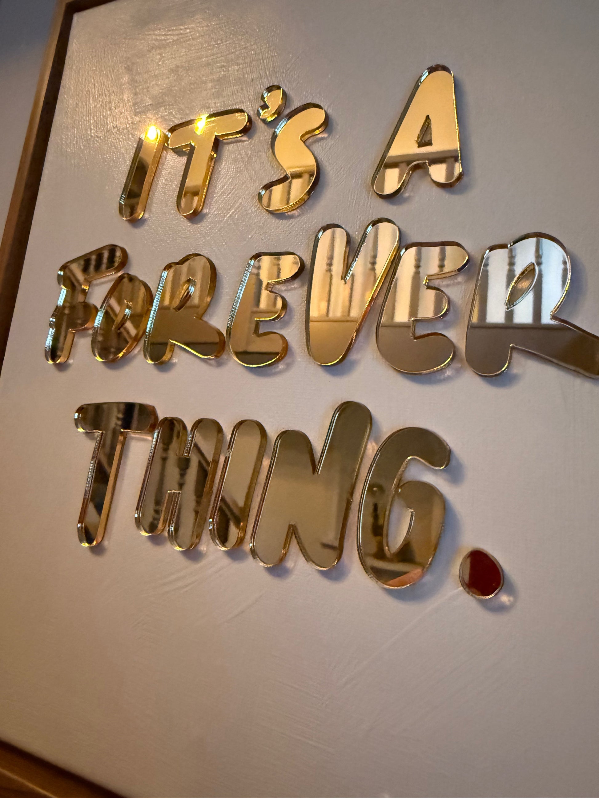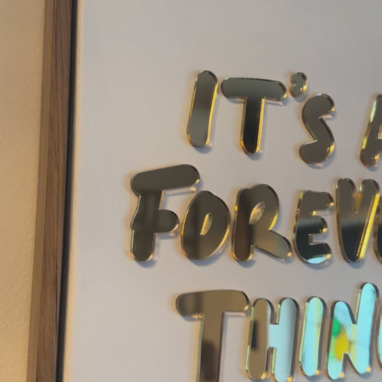 The phrase 'IT'S A FOREVER THING'. is expertly cut from acrylic and mounted on to the canvas, creating a striking contrast against the white background. The raised lettering adds a modern, sculptural feel that really stands out. Select your choice of mirror colours from the drop down box above. The colour used in the pictures is mirror gold.