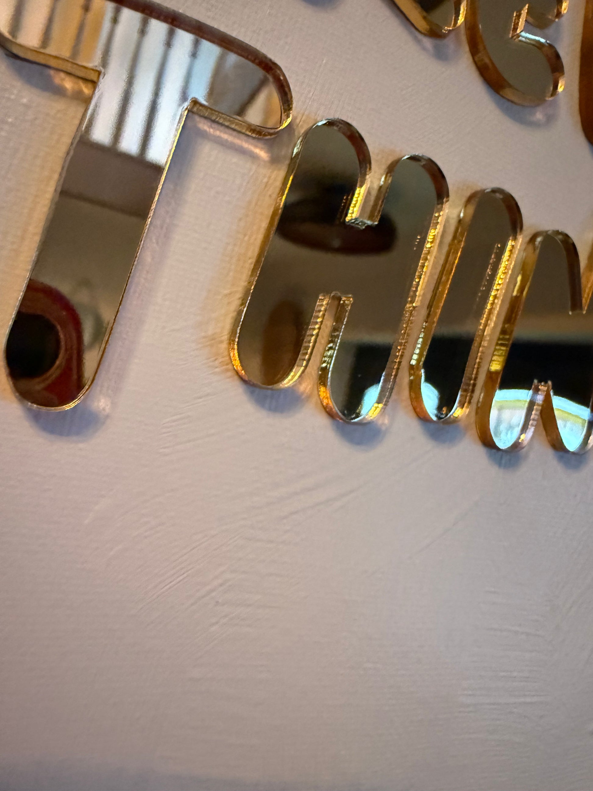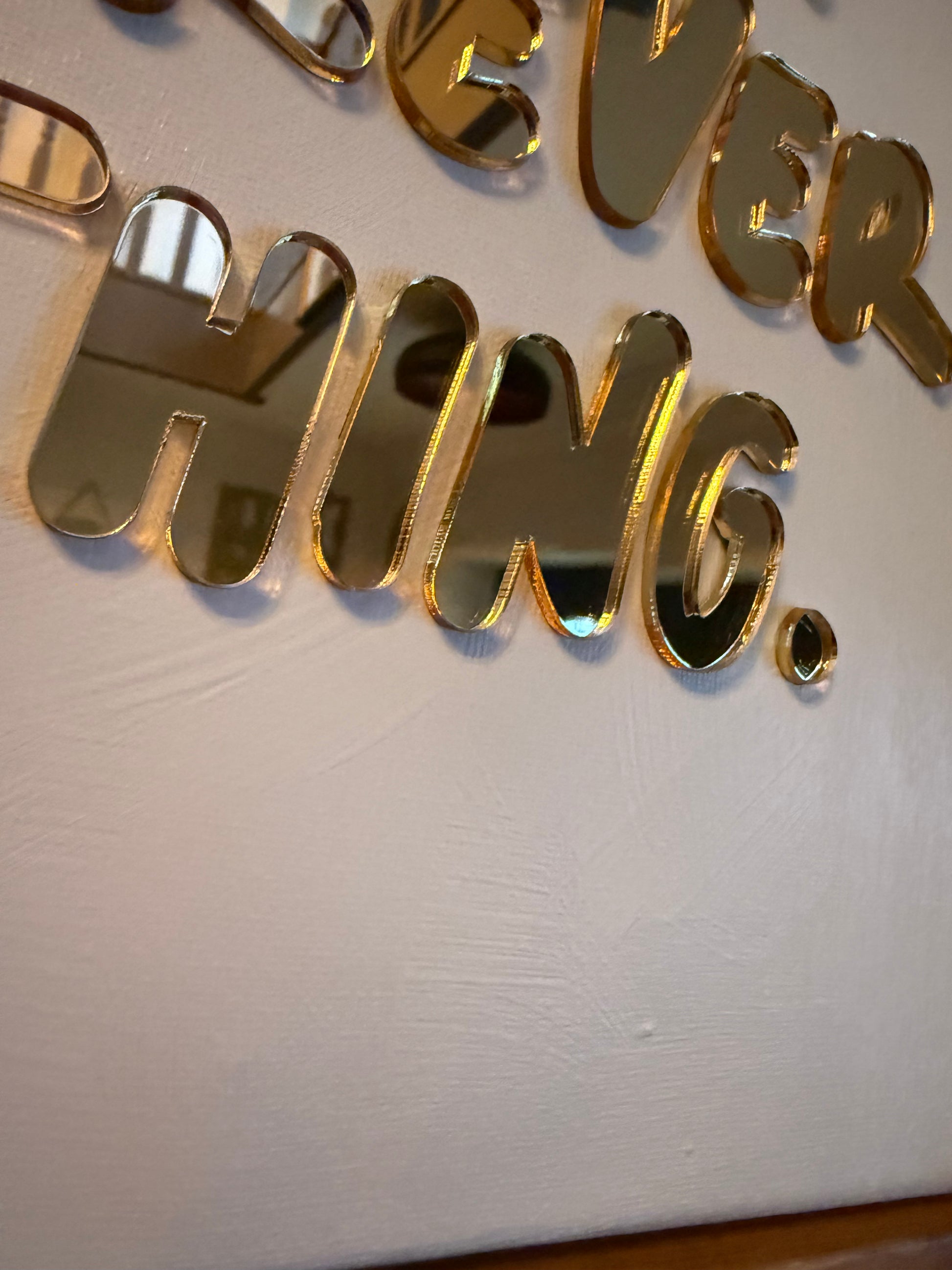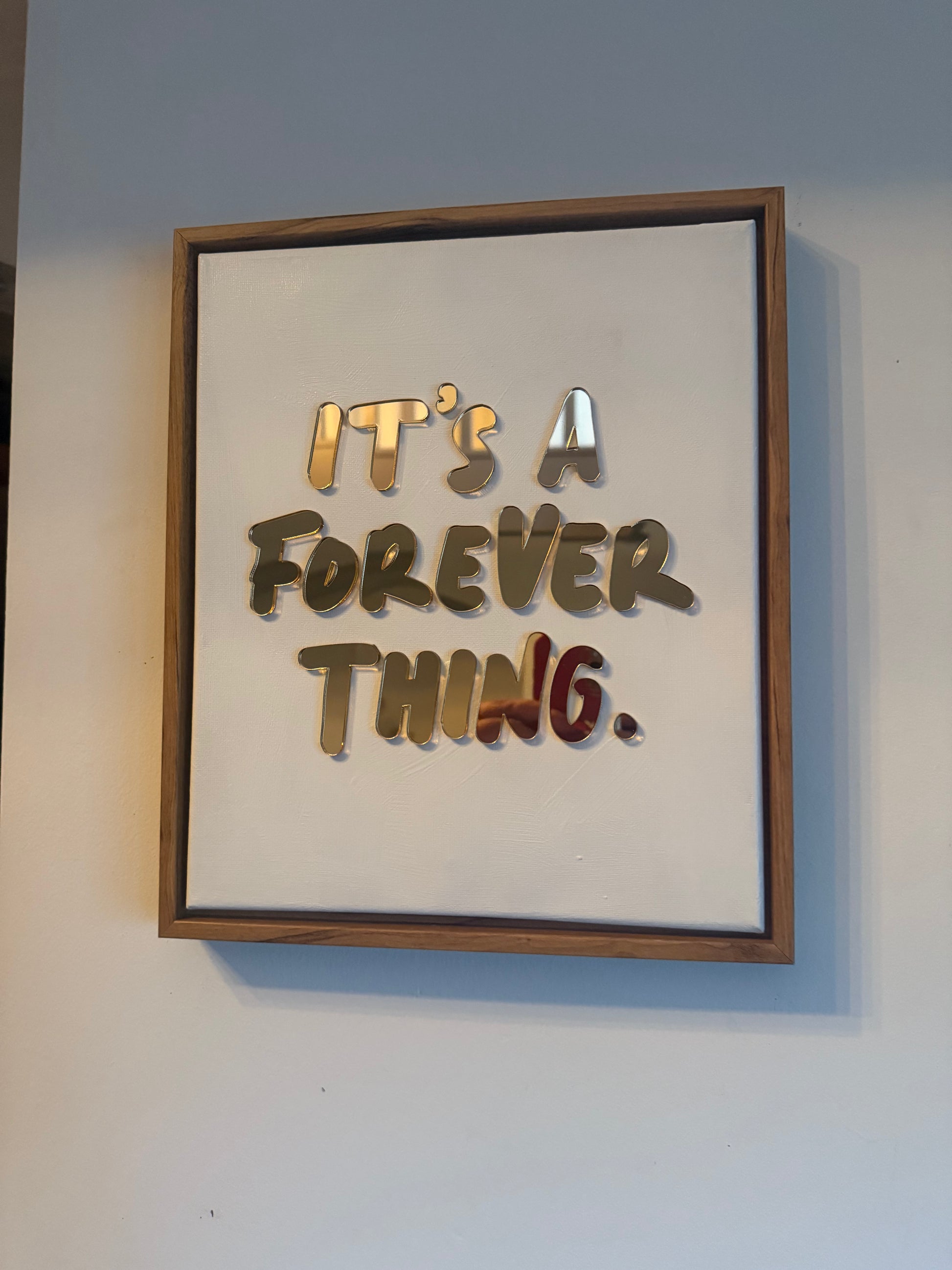 The phrase 'IT'S A FOREVER THING'. is expertly cut from acrylic and mounted on to the canvas, creating a striking contrast against the white background. The raised lettering adds a modern, sculptural feel that really stands out. Select your choice of mirror colours from the drop down box above. The colour used in the pictures is mirror gold.
