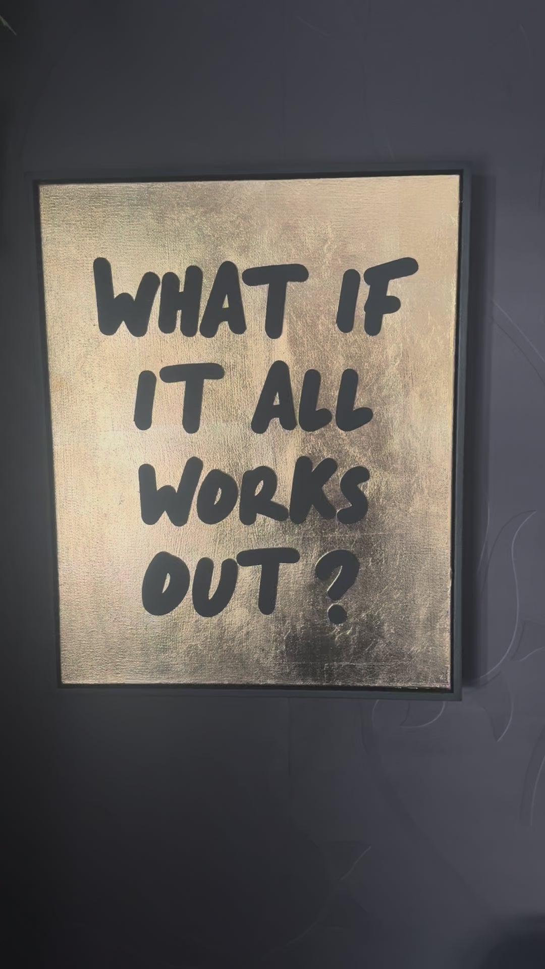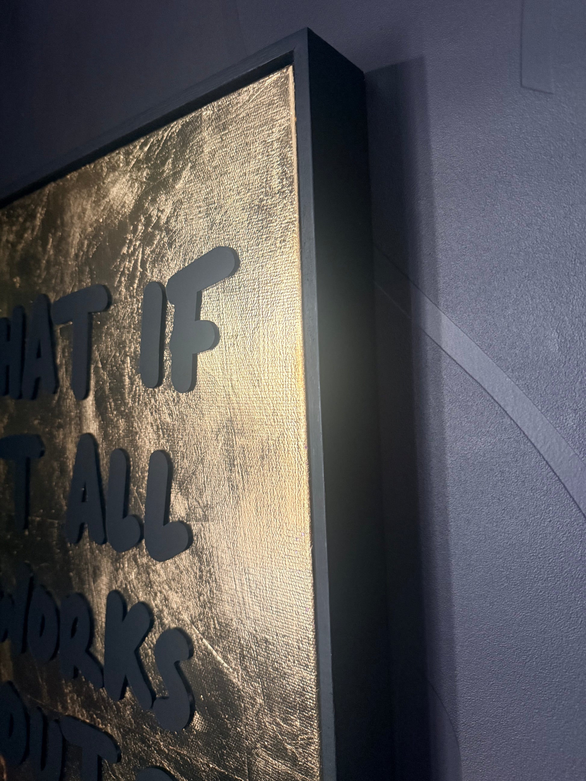 The phrase 'WHAT F IT ALL WORKS OUT?' is expertly cut from black matt acrylic and mounted on to the canvas, creating a striking contrast against the warm metallic background. The raised lettering adds a modern, sculptural feel that really stands out.